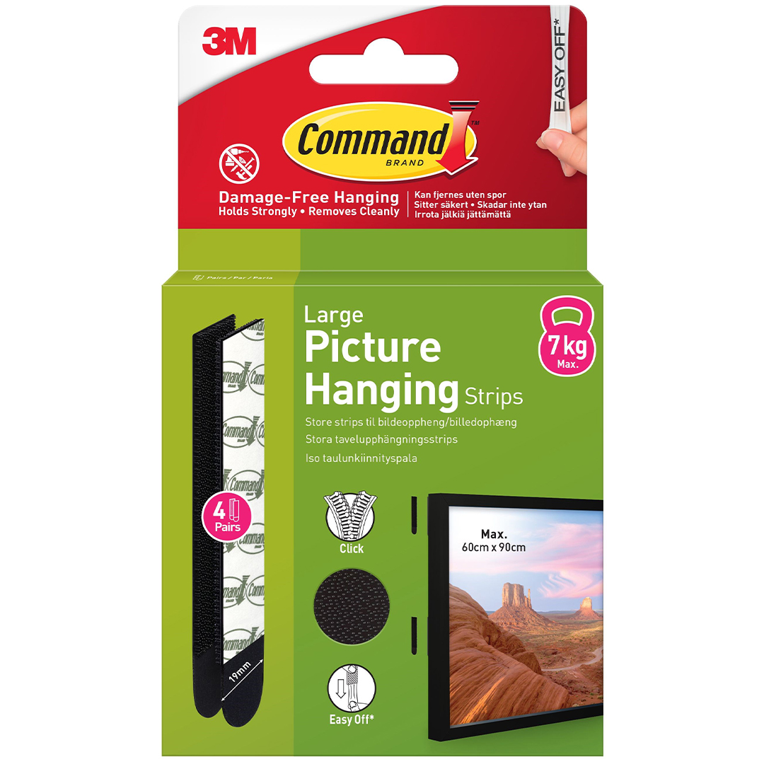 L’emballage contient 4 ensembles de bandes noires et fines. Peut supporter un cadre jusqu’à 7 kg et mesurant jusqu’à 60 x 90 cm.