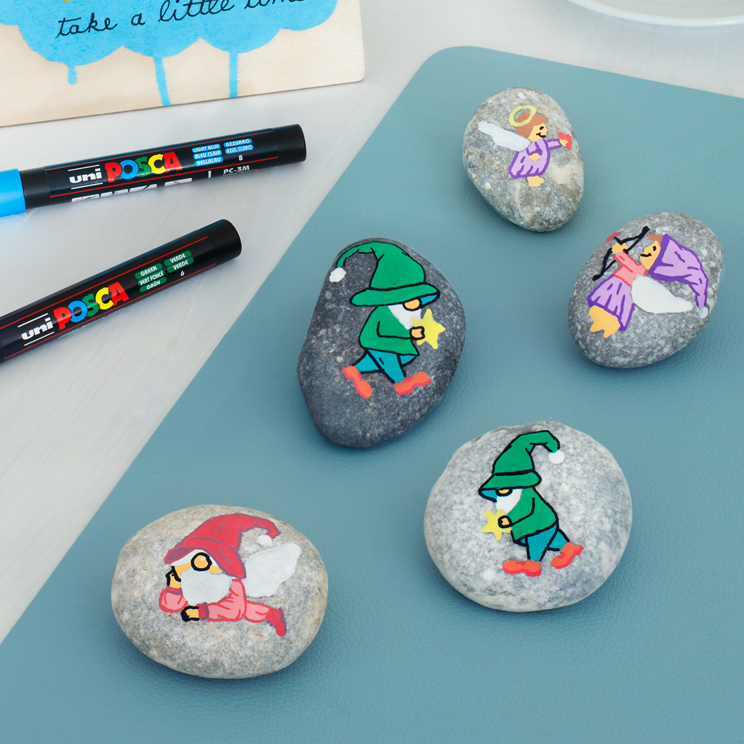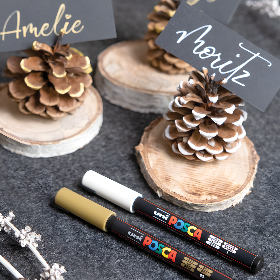 De petits cailloux se transforment en lutins, sapins ou étoiles et apportent une note charmante et inattendue entre les serviettes et les verres. Les pommes de pin sont elles aussi parfaites à transformer. Quelques touches de doré ou d’argenté les rendent festives, et en glissant un petit carton avec le prénom, tu obtiens des marque-places à la fois simples, soignés et très hivernaux. Si tu as d’autres objets à la maison, comme des sous-verres en bois, des pions de jeu ou des petits bocaux en verre, tu peux eux aussi les customiser avec Posca.