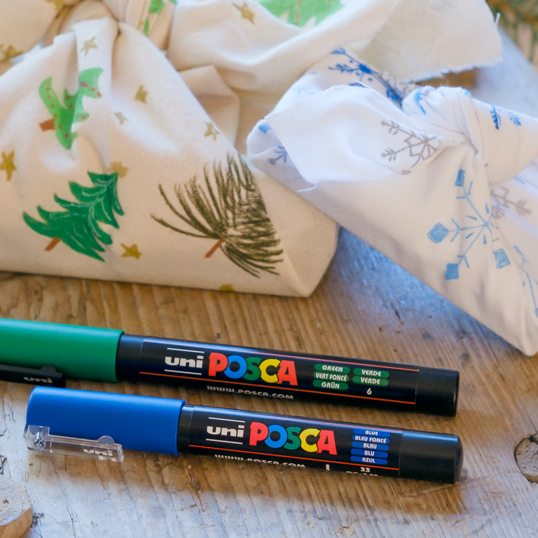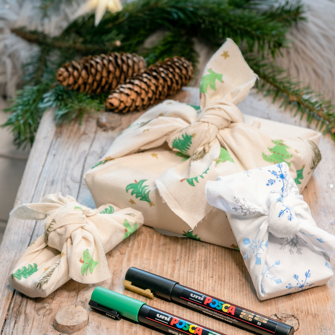 L’emballage en tissu est devenu de plus en plus tendance, et on comprend facilement pourquoi. Il apporte une touche chaleureuse et réconfortante, tout aussi attentionnée que le cadeau lui-même. Avec de vieux draps, des nappes ou des chutes de tissu, vous pouvez créer des emballages à la fois durables et totalement uniques — et avec Posca, il est très simple d’ajouter motifs, détails et petits messages. Bonus : glissez une petite décoration dans le nœud, comme une brindille, une fleur ou un peu de friandises de Noël pour encore plus de charme.