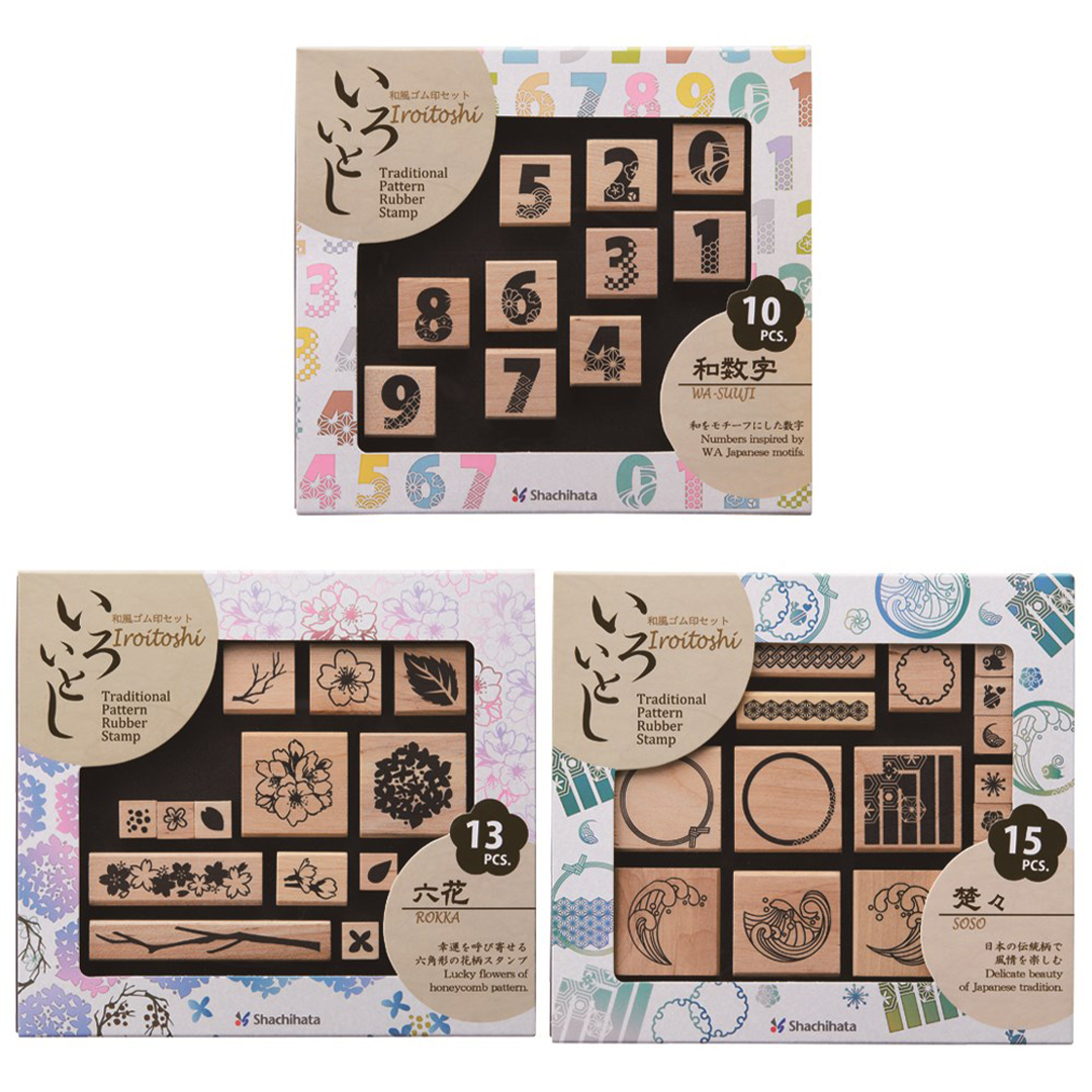 "Iroitoshi" est une série de sets de tampons représentant des motifs japonais. Chaque set comprend un ensemble de tampons en bois avec une impression en caoutchouc inspirée du patrimoine et de la culture japonaise. Les tampons sont parfaits pour le scrapbooking, le journaling ou d'autres projets créatifs.