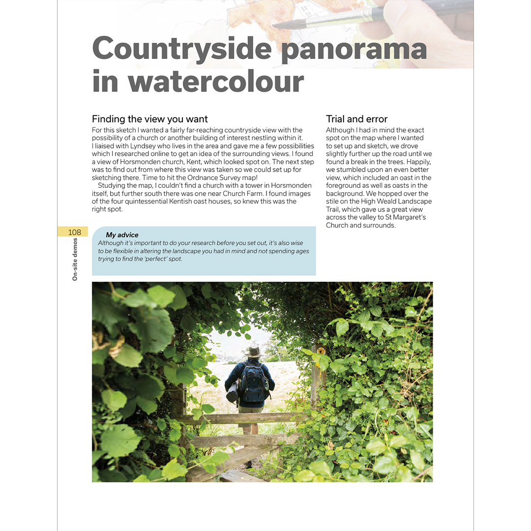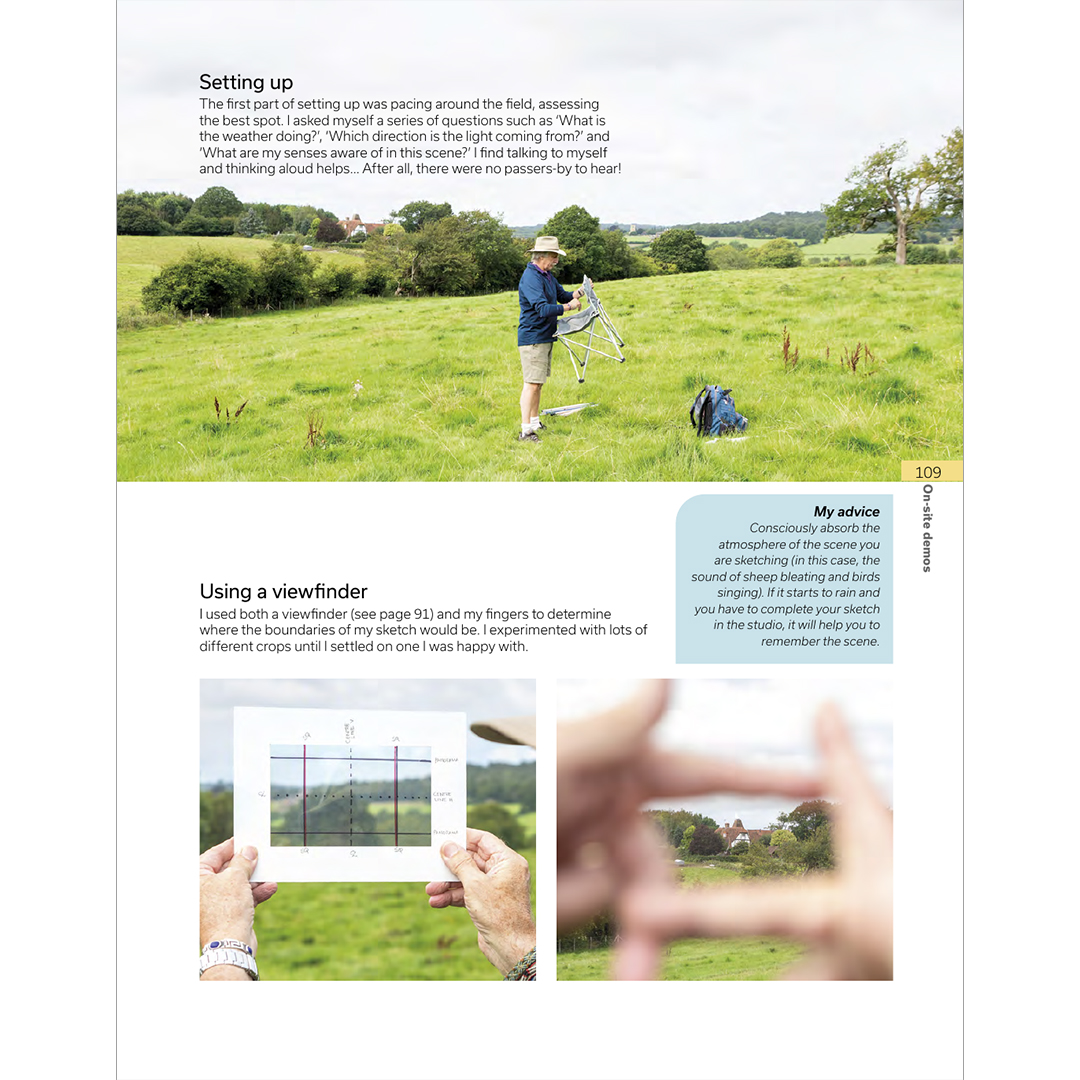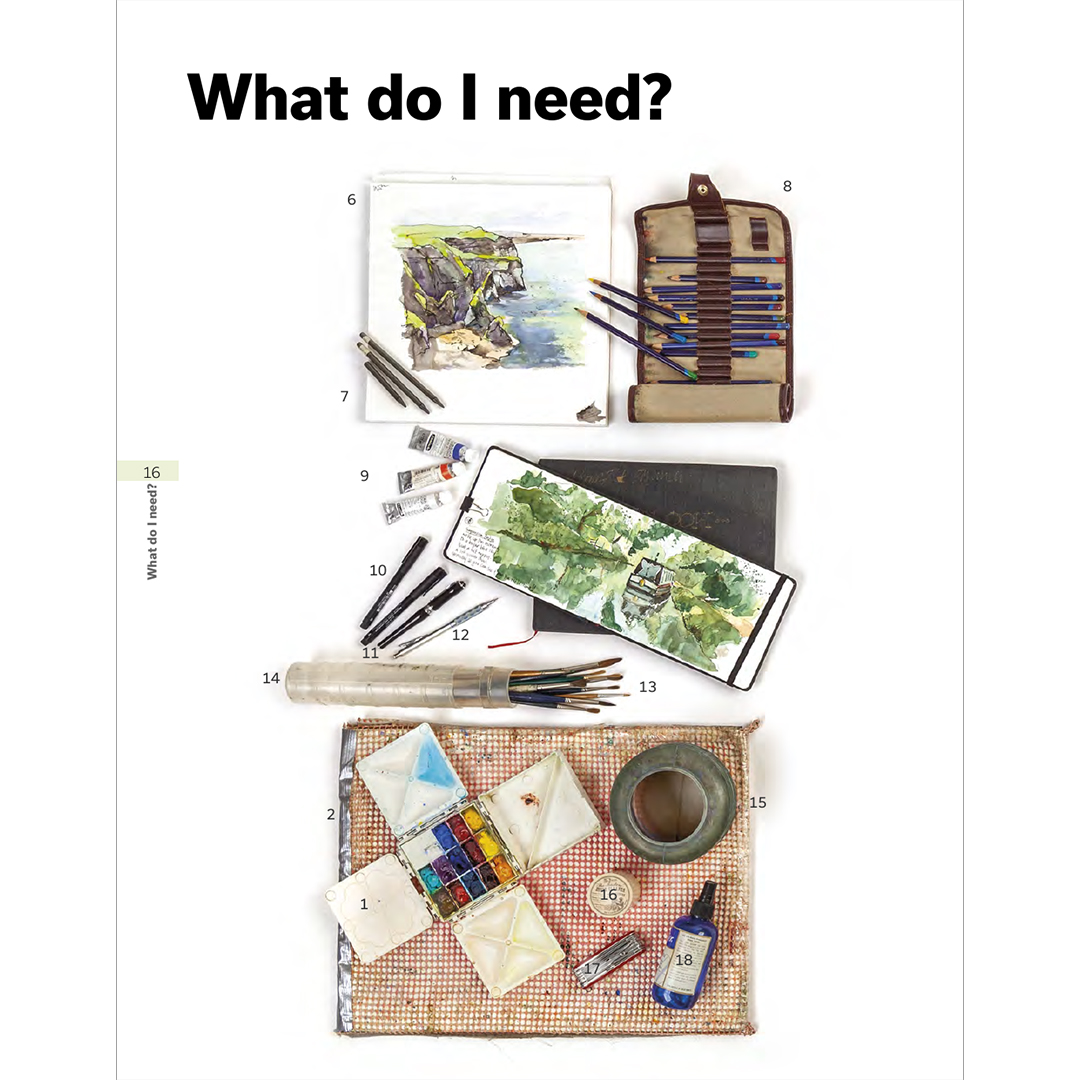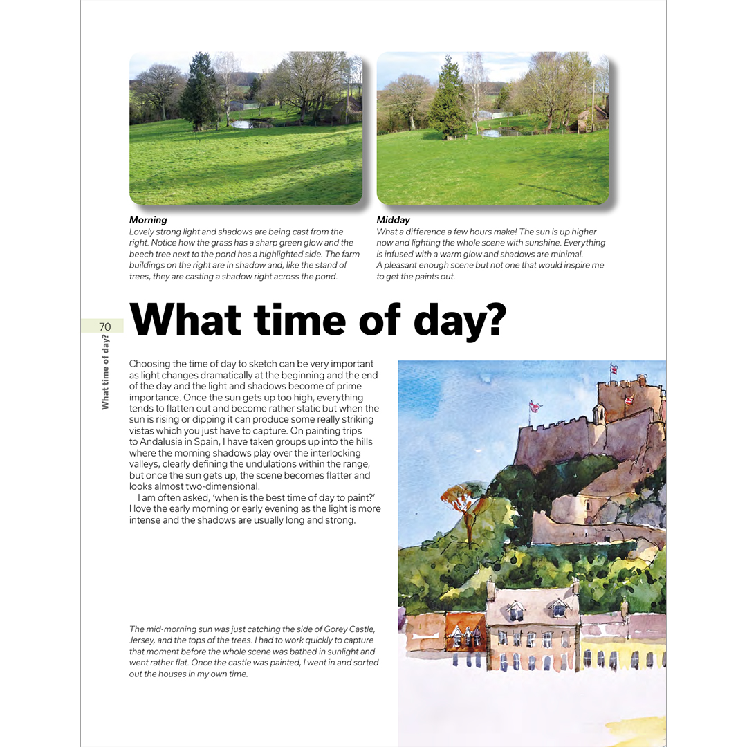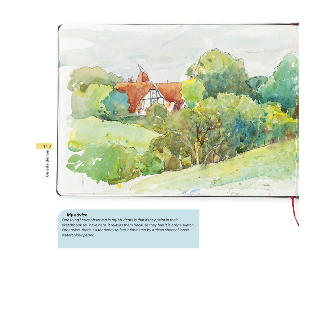 C’est un livre pratique que vous garderez toujours à portée de main. Il est rempli d’œuvres inspirantes et présente cinq démonstrations : une scène côtière à l’encre ; un panorama de campagne à l’aquarelle ; un village anglais typique en gouache ; un paysage urbain en ligne et lavis d’aquarelle ; et des arbres aux crayons aquarelle.