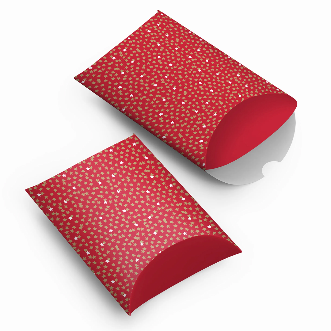 DESIGN: Petites étoiles sur fond rouge, une boîte cadeau avec motifs scintillants, idéale pour emballer un cadeau de Noël ou d’anniversaire.