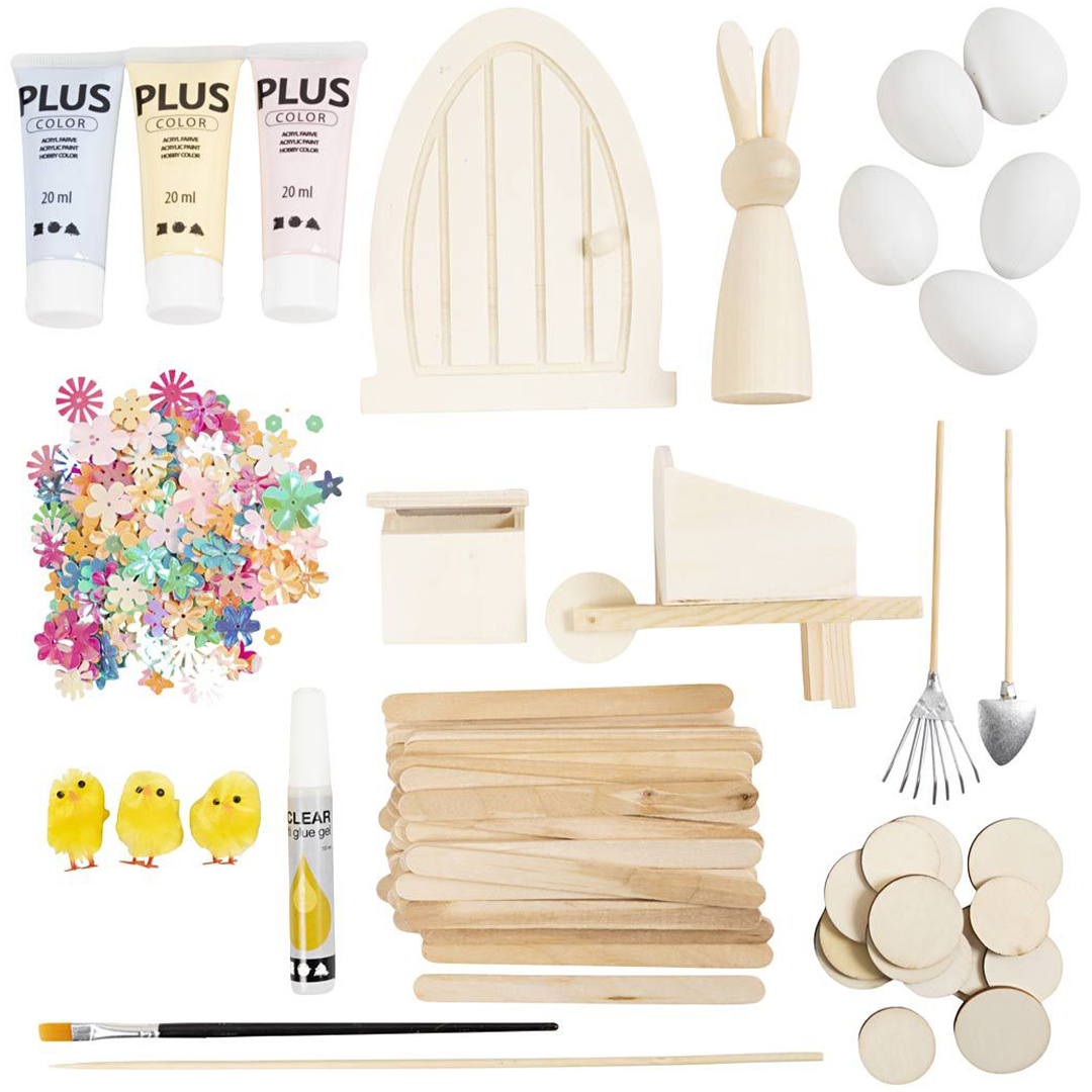 Contenu : porte, lapin, boîte aux lettres, râteau, pelle, brouette, poussins, œufs en plastique, paillettes fleurs, disques en bois, bâtonnets de glace, tuteurs, peinture artisanale Plus Colour, pinceau et colle.