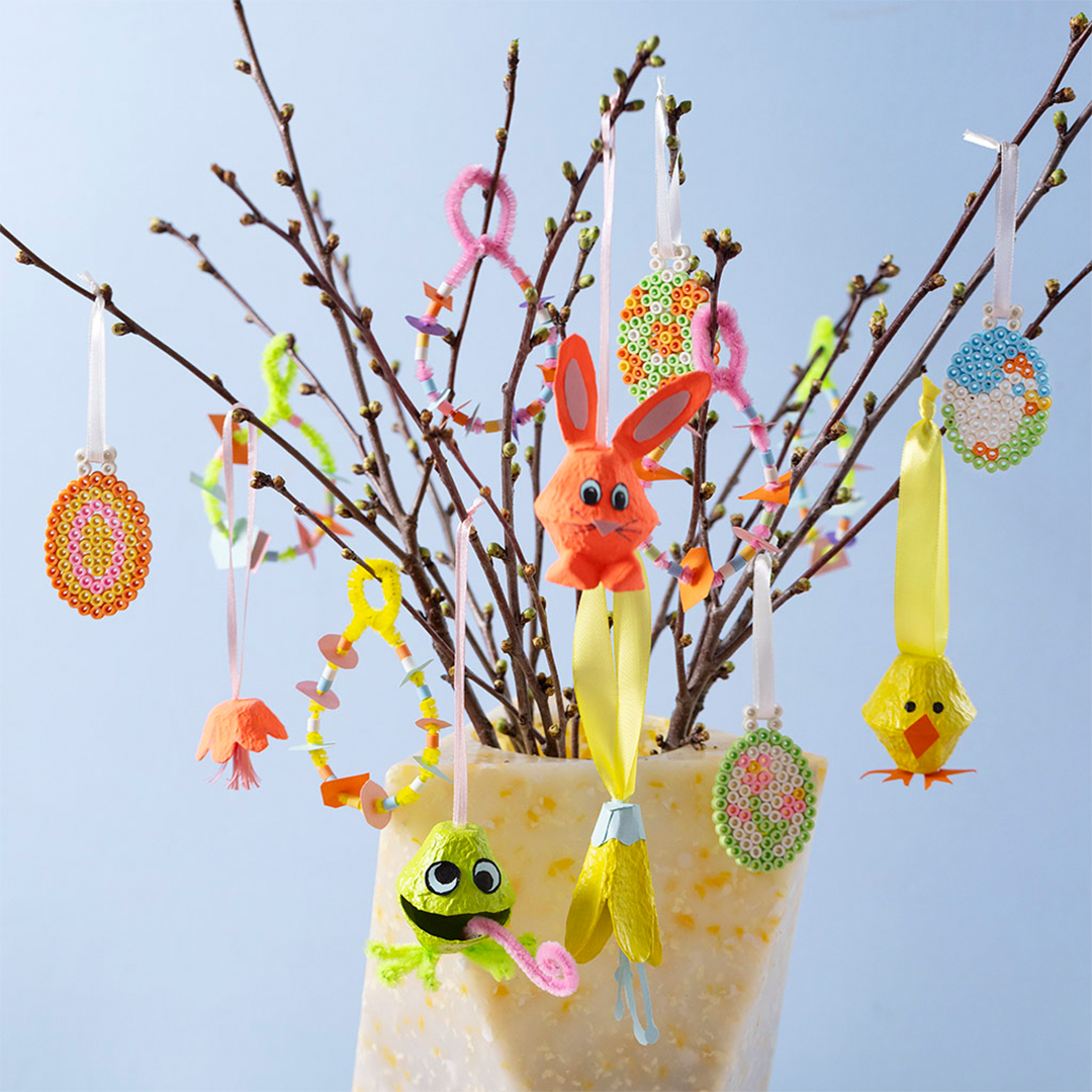 Rassemblez toute la famille et fabriquez plein de décorations dans des couleurs pastel cool et printanières. Il y a des décorations de tous niveaux de difficulté pour que petits et grands puissent participer et s'amuser. Faites de petites figurines mignonnes avec des boîtes à œufs, décorez des œufs avec des rubans de soie et des œufs simples avec du fil chenille, des motifs en carton et des perles tubulaires. Vous pouvez aussi créer des fleurs de printemps avec des boîtes à œufs ou du carton ordinaire. Faites-en un beau bouquet printanier qui dure éternellement.