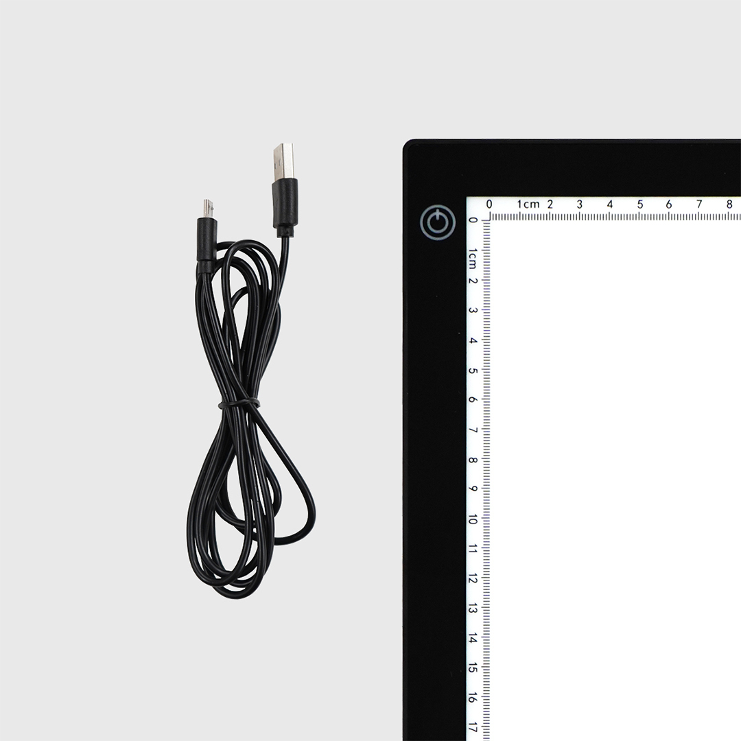 La table lumineuse est éclairée par LED, a une surface acrylique et ne fait que 5 mm ( !) d'épaisseur. La lumière de travail est de 240-260 lumens et peut être réglée sur trois niveaux différents. La durée de vie des lampes est d'environ 5 000 heures. La table lumineuse est équipée d'une règle sur deux côtés.