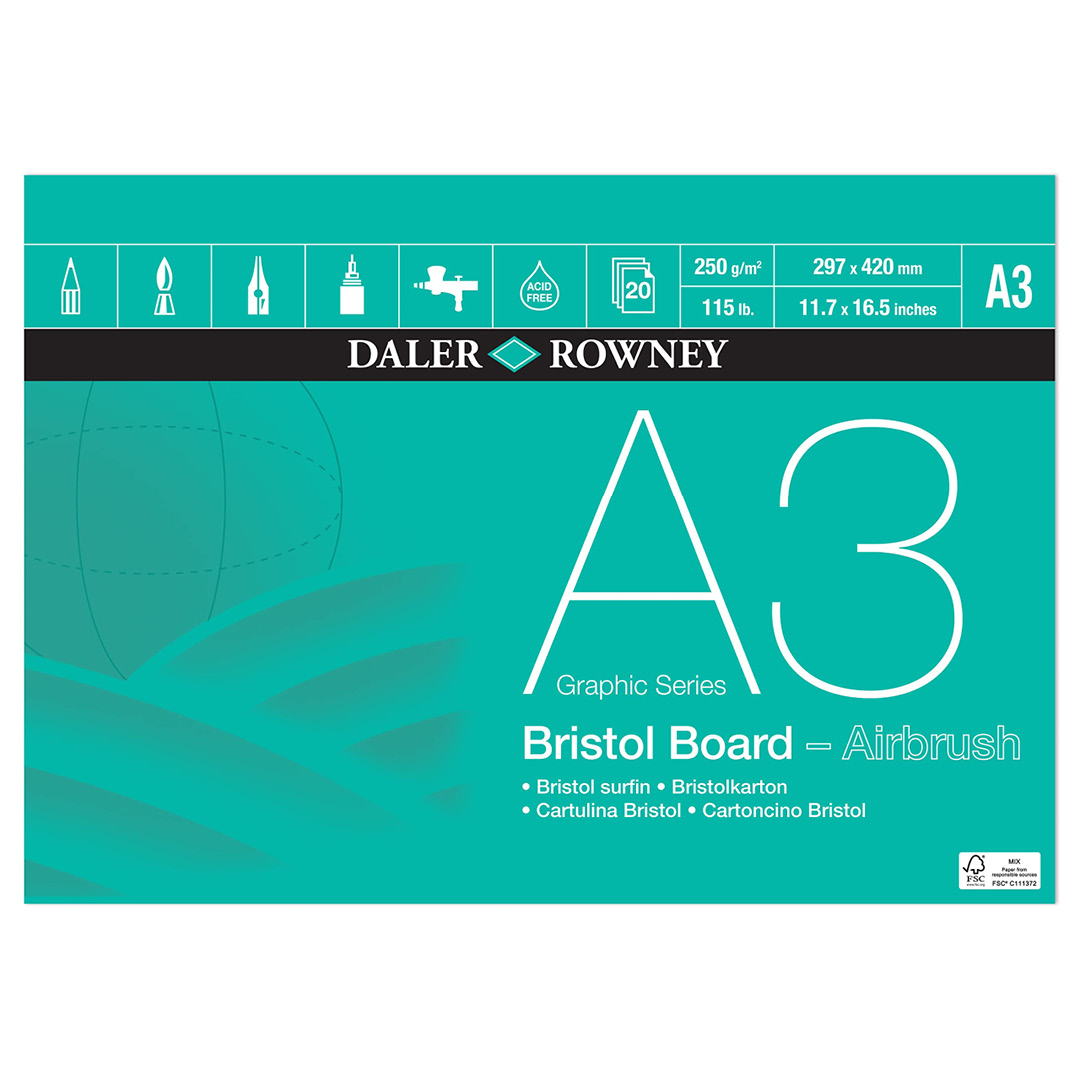 Daler-Rowney Bristol Board est un papier très résistant avec un revêtement adapté à l'aérographe. Fonctionne également bien avec un feutre, de l'encre, un pinceau et un crayon graphite/crayon de couleur. 20 feuilles encollées par bloc. Poids/m2 : 250 g. Format : A3.