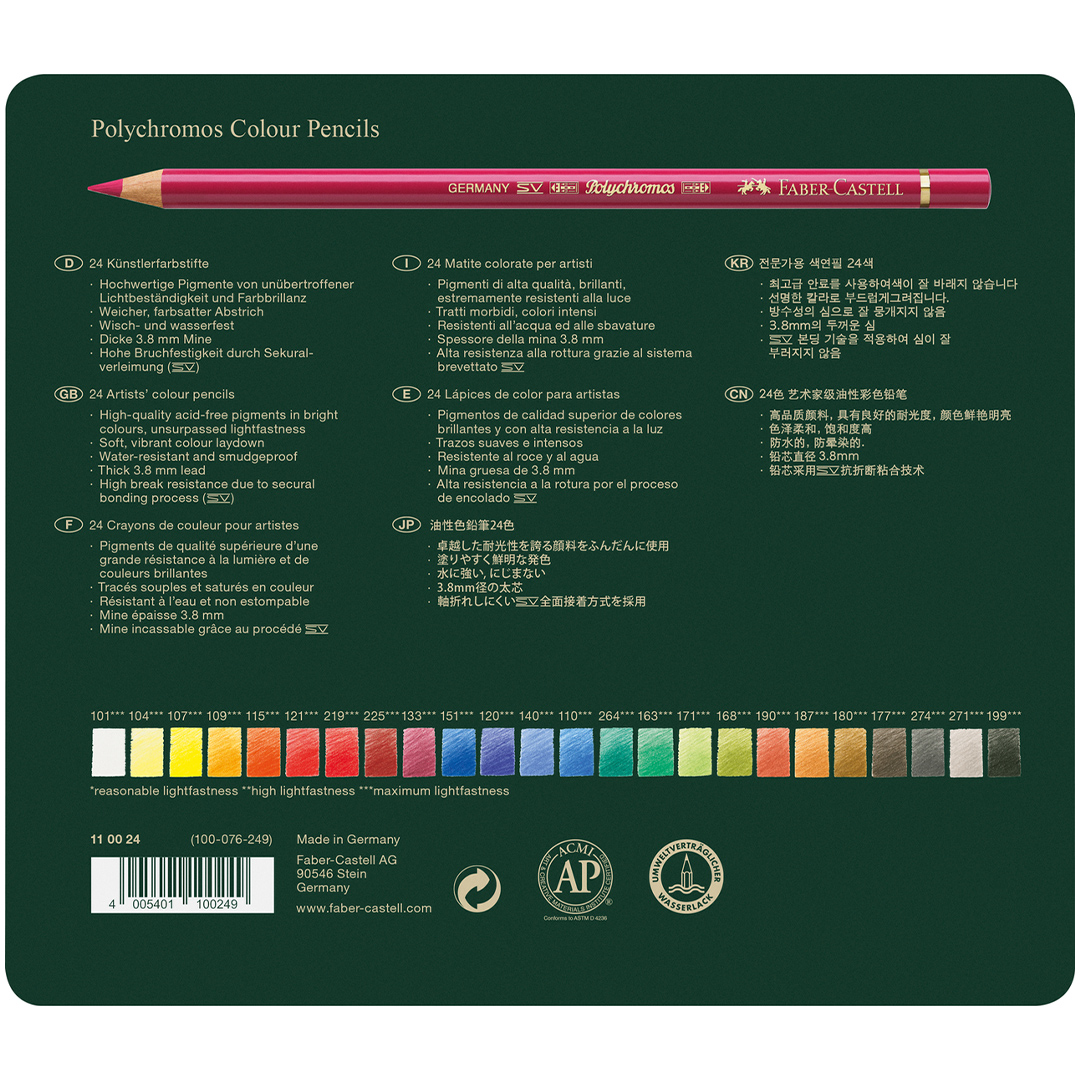 Grâce à leurs pigments de haute qualité, sans acide, les Polychromos offrent une solidité à la lumière inégalée qui préserve la brillance des couleurs pendant des décennies, ainsi qu’une résistance maximale à la casse, aux taches et à l’eau, et des qualités de dessin remarquables.