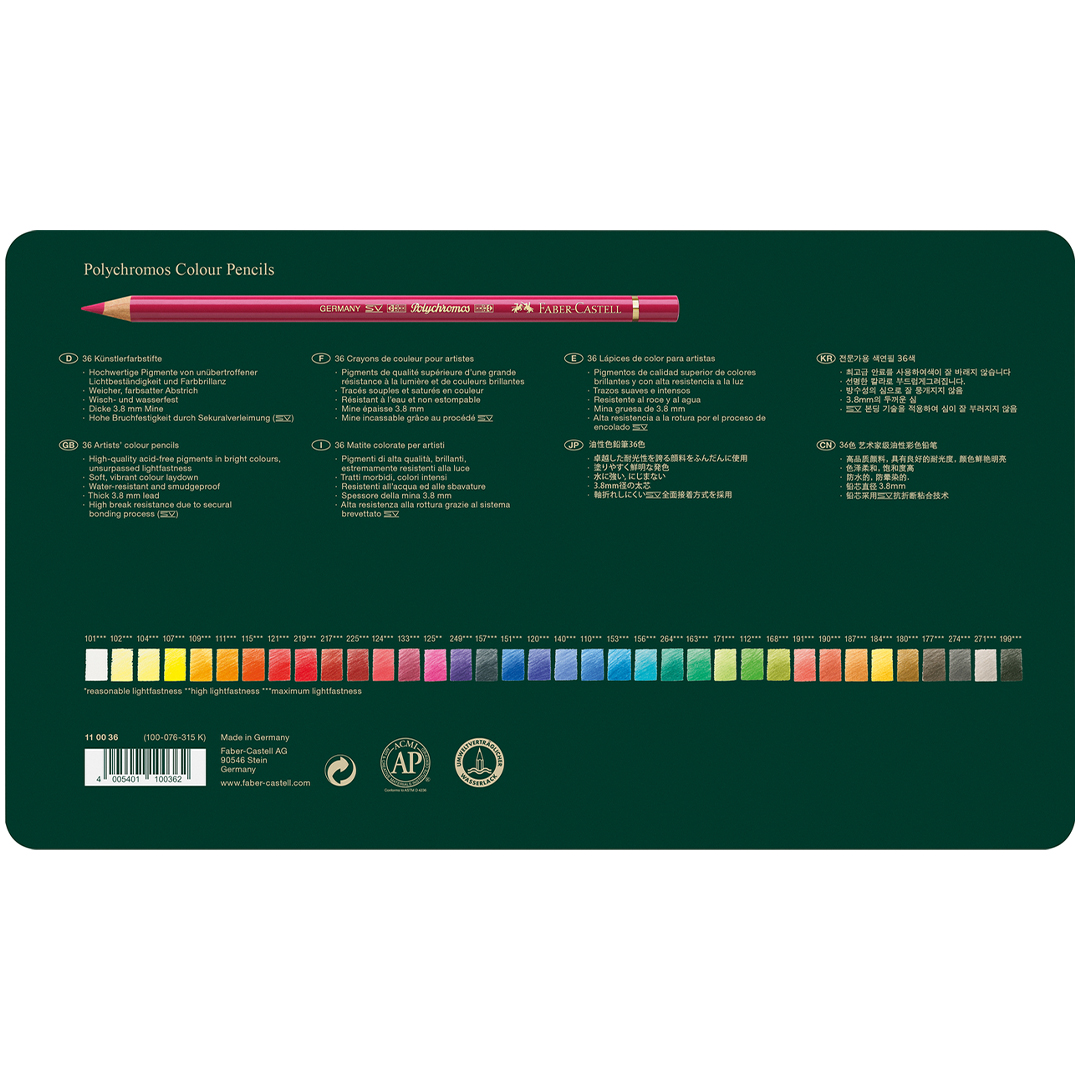 Grâce à leurs pigments de haute qualité, sans acide, les Polychromos offrent une solidité à la lumière inégalée qui préserve la brillance des couleurs pendant des décennies, ainsi qu’une résistance maximale à la casse, aux taches et à l’eau, et des qualités de dessin remarquables.