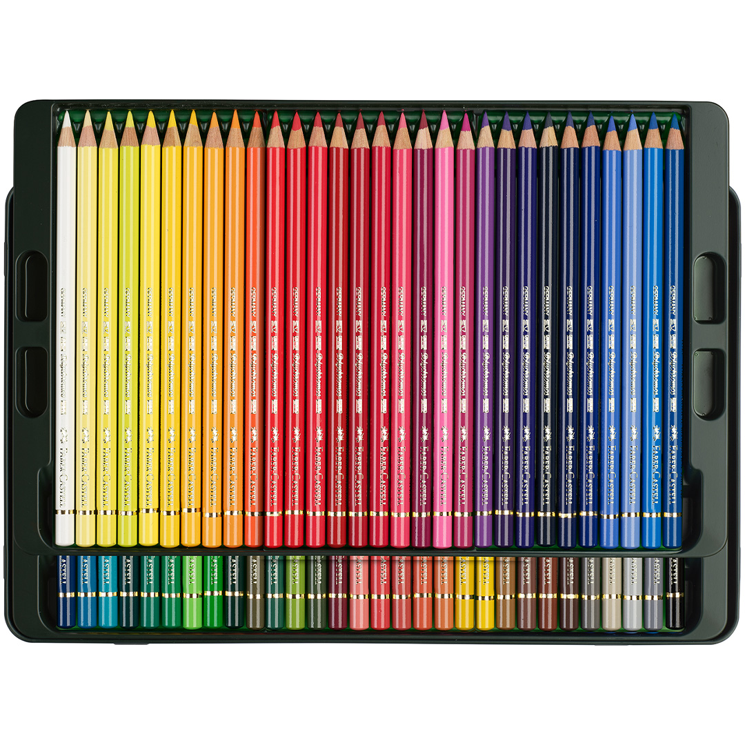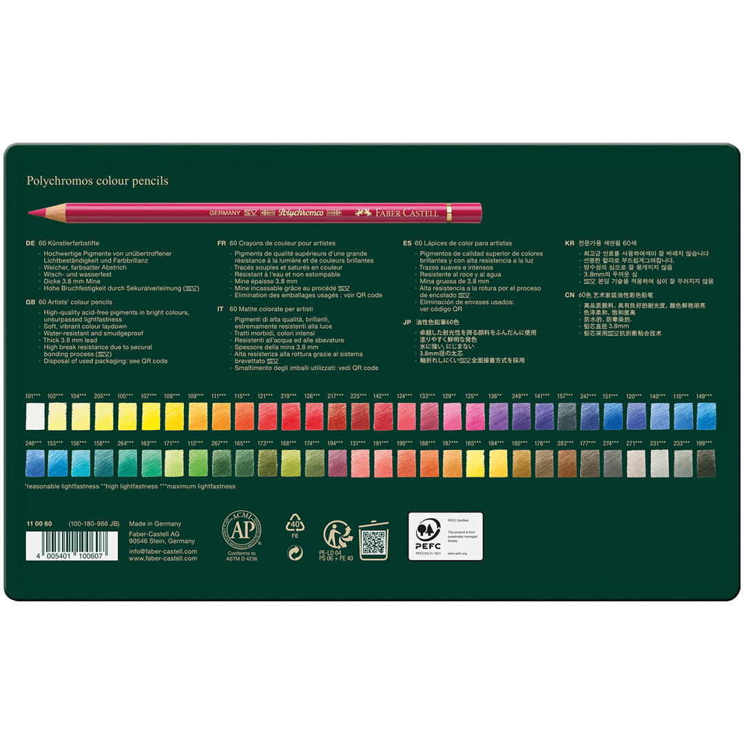 Ce set contient 60 Polychromos dans différentes couleurs, conditionnés dans un étui en métal robuste.
