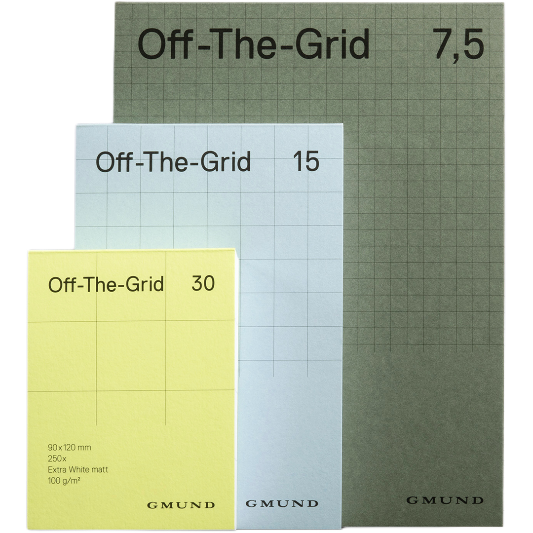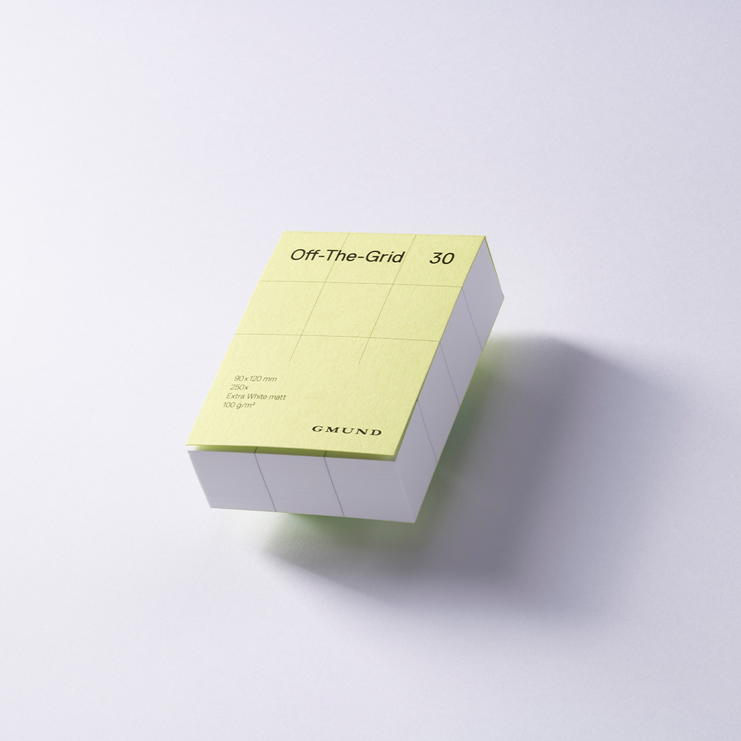 Le bloc contient 250 feuilles de papier mat, non couché, fabriqué à partir de fibres végétales, écologique et recyclable. En plus de son utilisation pratique, Off-The-Grid est également un objet de décoration qui trouve sa place sur le bureau de tout amateur de design. Produit certifié FSC.