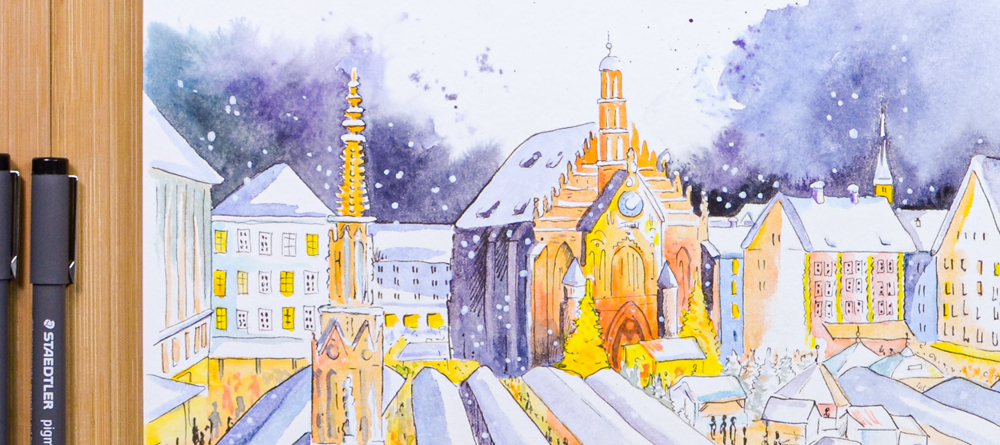 La plupart des gens pensent qu’un feutre fin est forcément noir – mais quelle erreur ! Certes, le noir est la couleur la plus courante, mais de nombreuses marques proposent bien d’autres variantes. La couleur de votre feutre fin peut grandement influencer l’ambiance de votre peinture. Encadrer les détails avec des lignes noires donne un rendu net et graphique, tandis qu’un stylo gris ou brun permet à la transparence de l’aquarelle de s’exprimer davantage. Et pourquoi ne pas essayer un feutre rouge ou vert ? Osez expérimenter et amusez-vous à tester différentes couleurs.