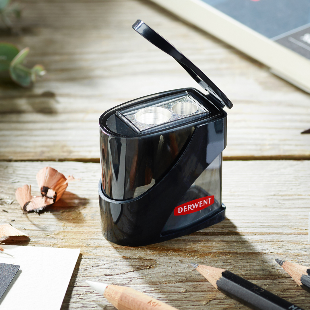 Commencez par insérer le crayon dans le premier trou pour enlever le bois autour de la mine. Ensuite, passez au deuxième trou pour affiner la mine et créer une pointe parfaitement longue et fine. Le résultat : une pointe très acérée. Ce taille-crayon est compact et ne possède pas de réservoir. - Derwent Super Point Taille-crayon