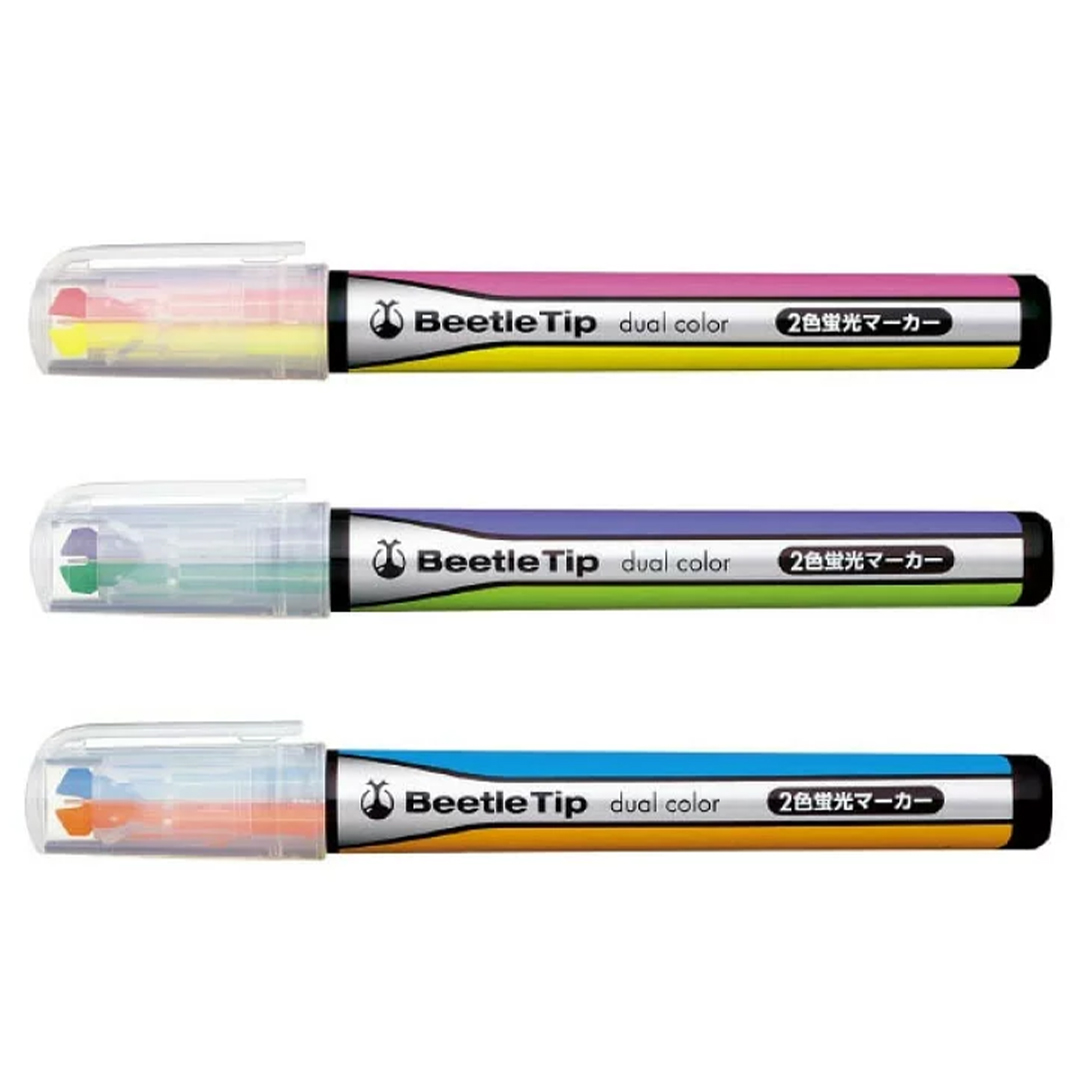 Le set contient 3 Kokuyo Beetle Tip Dual Color avec les combinaisons de couleurs : Orange/Bleu, Vert/Violet et Jaune/Rose.