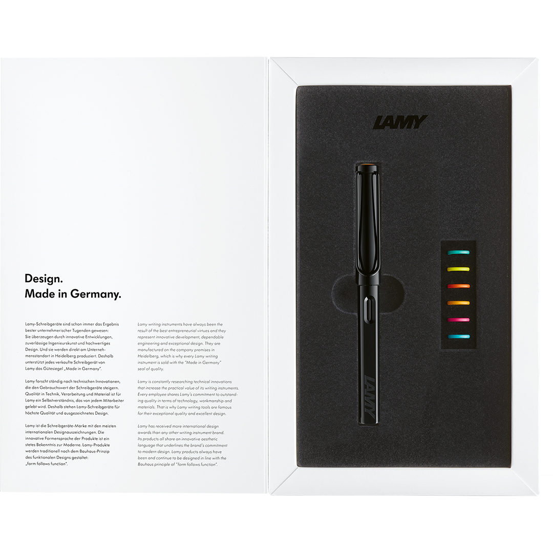Le stylo est livré avec une cartouche d’encre bleue LAMY T 10 et une plume en acier de largeur moyenne qui offre une expérience d’écriture douce et fiable à chaque utilisation. Le set est présenté dans une élégante boîte cadeau et constitue un cadeau parfait autant pour les débutants découvrant la joie d’écrire que pour les collectionneurs expérimentés. Avec le LAMY Safari Multicolour, chaque moment d’écriture devient une occasion d’exprimer sa personnalité.