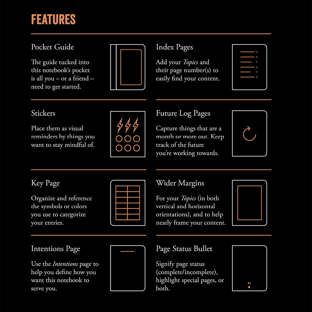 La Bullet Journal Edition 2 dispose aussi de marges et de repères supplémentaires pour organiser et retrouver facilement vos contenus. Table des matières, future log, index et stickers inclus facilitent la personnalisation et le côté pratique du carnet. Un élastique maintient le carnet fermé et une pochette intérieure se trouve dans la couverture arrière.