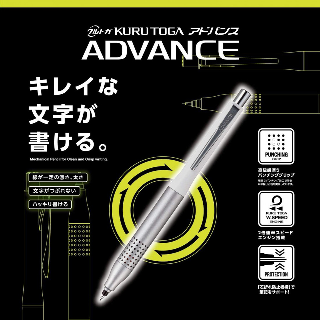 Kuru Toga Advance Upgrade est une version améliorée du célèbre Kuru Toga Advance, conçu pour offrir une précision et un confort d'écriture maximaux. Le crayon est doté d'un mécanisme unique qui fait tourner automatiquement la mine à chaque trait, une innovation qui garantit une largeur de trait nette et régulière. Associé à la gaine métallique élastique qui protège la mine contre les cassures, ce crayon est particulièrement efficace pour les longues sessions d'écriture.
