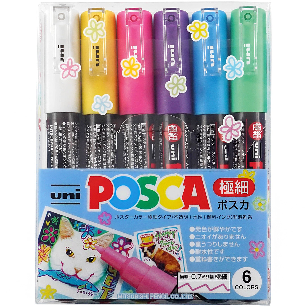 Uni Posca est un stylo à peinture couvrante à base d'eau avec des pigments qui adhèrent sur de nombreuses surfaces comme le papier, le carton, le bois, la pierre, le textile, le verre, le plastique et le métal. La couleur est permanente sur de nombreux supports poreux et peut être enlevée des surfaces lisses, ce qui facilite les expérimentations sans abîmer le support. La couleur sèche rapidement, est inodore et convient aussi bien aux projets de bricolage spontanés qu'aux travaux artistiques plus avancés.