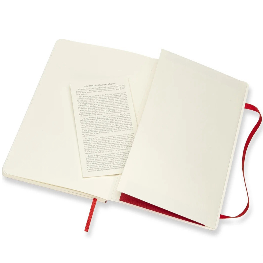 Carnet à couverture souple et flexible au format Large (13 × 21 cm) de la marque italienne Moleskine. Le carnet contient 192 pages et possède une pochette intérieure extensible ainsi qu’un élastique qui maintient le carnet fermé lorsqu’il n’est pas utilisé. Le papier ivoire est certifié FSC, sans acide et de haute qualité!