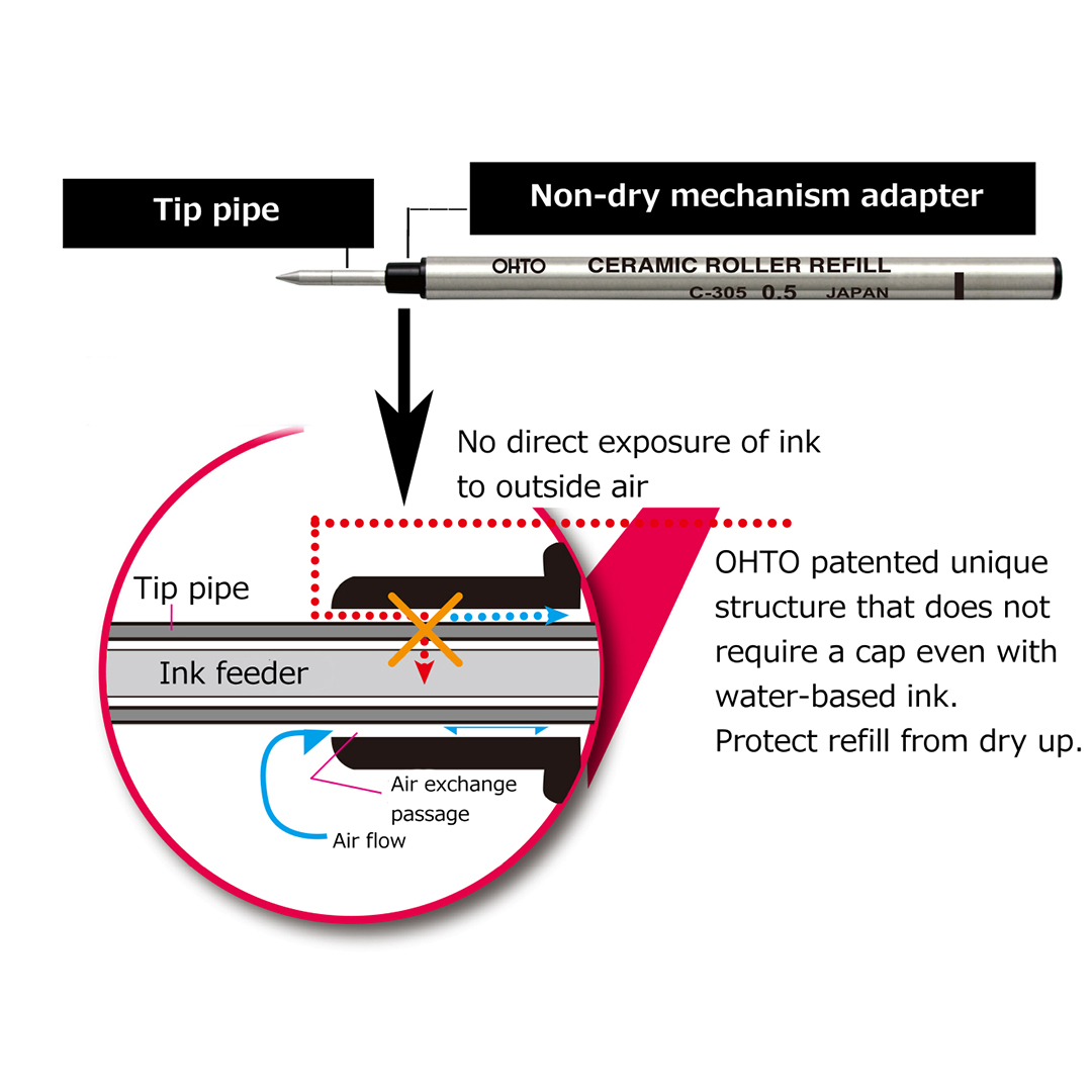 La technologie brevetée « Non-dry » empêche la pointe de sécher en protégeant l’arrivée d’encre du contact direct avec l’air, éliminant ainsi le risque de vide d’air et de projections d’encre. Cela garantit que votre stylo est toujours prêt à écrire sans bavures.