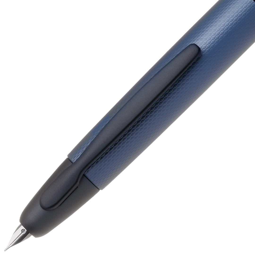 Le stylo présente un corps en maille milanaise bleu nuit avec une texture guillochée satinée et des détails noirs mats élégants. Il est équipé d’une plume en or 18 carats fumée. Le mécanisme unique à clic du stylo rétracte la plume dans le corps du stylo lorsqu’elle n’est pas utilisée.