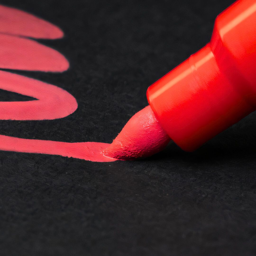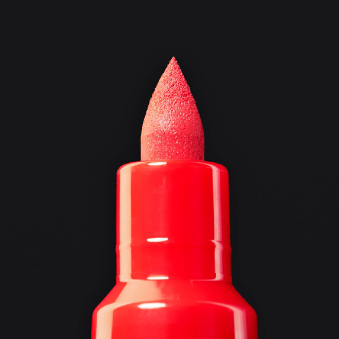 Le Posca Brush se distingue par sa pointe unique. Contrairement à un pinceau classique, il n’a pas de poils, mais la même pointe ferme et solide qu’un Posca marker traditionnel. Sa forme est toutefois celle d’un pinceau, large à la base et fine à la pointe. Elle est semi-flexible, ce qui signifie qu’elle est assez rigide pour assurer un flux de couleur régulier, mais suffisamment souple pour se plier juste ce qu’il faut pour des traits amples et fluides. Selon la pression, vous pouvez tracer des lignes d’environ 1 à 4 mm. La pointe est en plus assez résistante pour supporter des surfaces rugueuses et peut être retournée pour prolonger la durée de vie du stylo.