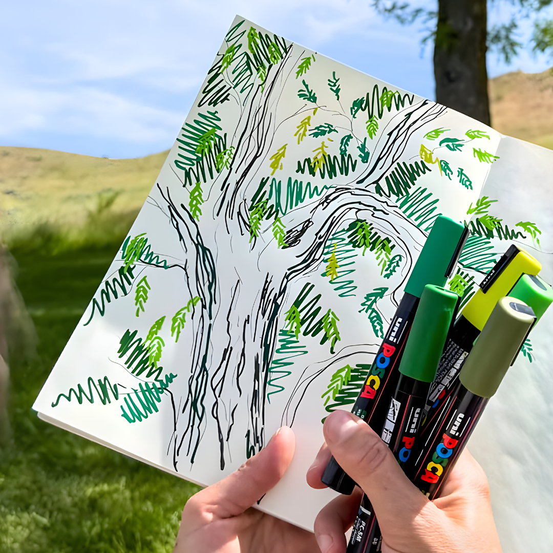 Avec sa toute nouvelle pointe, vous profitez du meilleur des deux mondes. La pointe est aussi ferme et régulière qu’un marqueur classique, mais suffisamment souple pour offrir une sensation plus picturale. Cela signifie que Posca n’est plus réservé aux expressions graphiques ou au street art, mais qu’il devient aussi un choix évident pour tous ceux qui aiment esquisser, dessiner et peindre de façon plus organique. Voici quelques exemples où il révèle tout son potentiel :