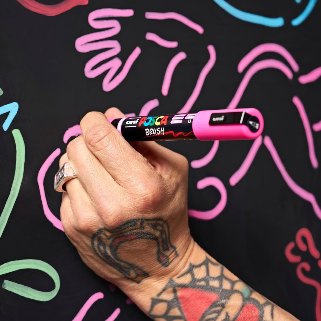 Le Posca Brush est la toute dernière nouveauté de la célèbre famille Posca, un favori culte chez les créateurs du monde entier. Du street art aux projets scolaires, des illustrateurs professionnels aux passionnés de DIY, Posca est utilisé par des créateurs de tous âges et de tous styles. Avec une large gamme de pointes et de couleurs, il existe un Posca pour chaque idée – et désormais aussi avec une pointe pinceau semi-flexible !