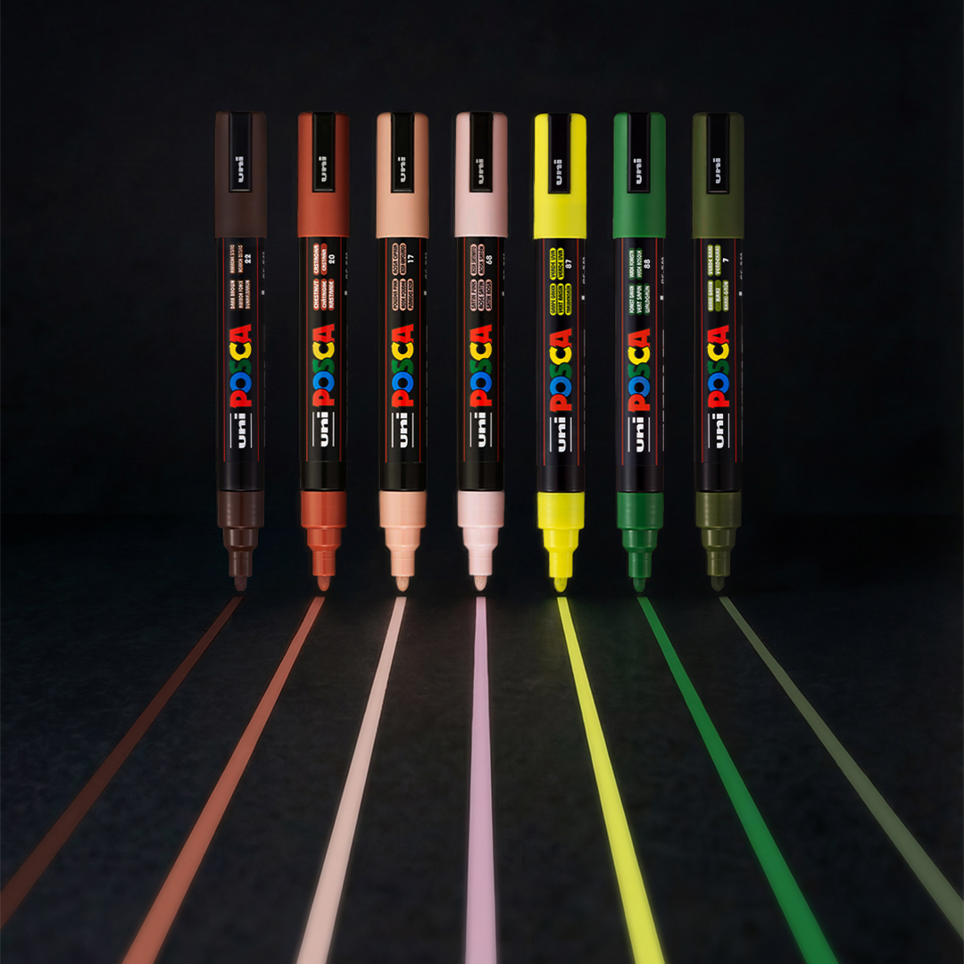 Posca est un marqueur acrylique iconique et polyvalent, apprécié par les artistes, les amateurs et les créateurs du monde entier. Les marqueurs sont remplis d’encre à base d’eau, opaque, qui donne vie à vos idées – même sur des surfaces sombres ou transparentes.