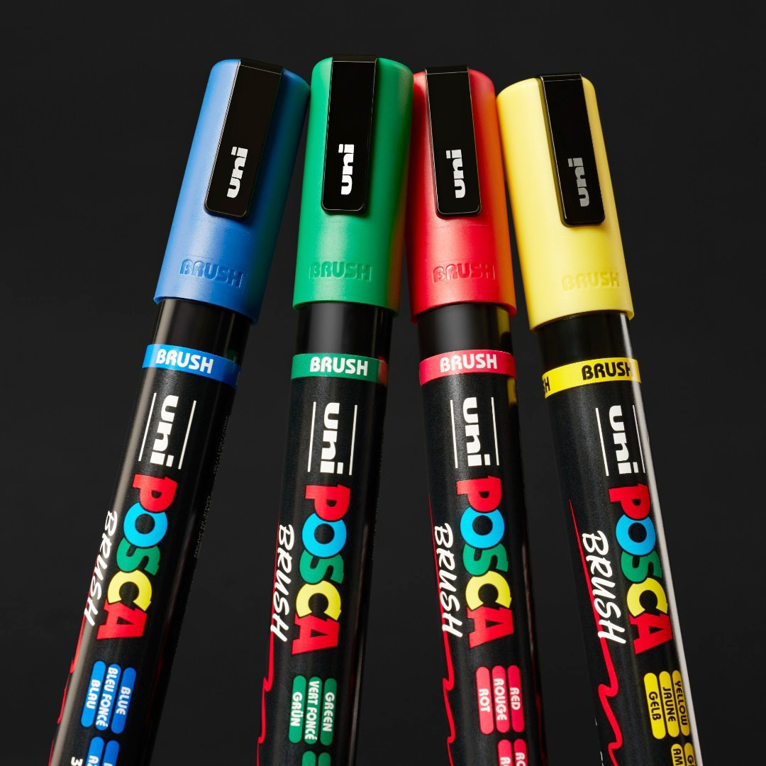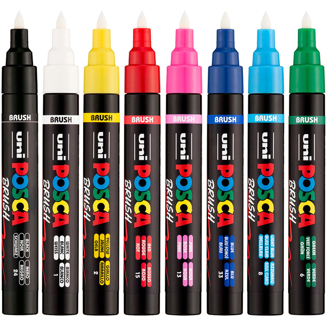 Le set contient 8 Posca Brush PC-5BR aux couleurs noir, blanc, jaune, rouge, rose, bleu, bleu clair et vert – une palette de base parfaite pour tous vos projets créatifs.