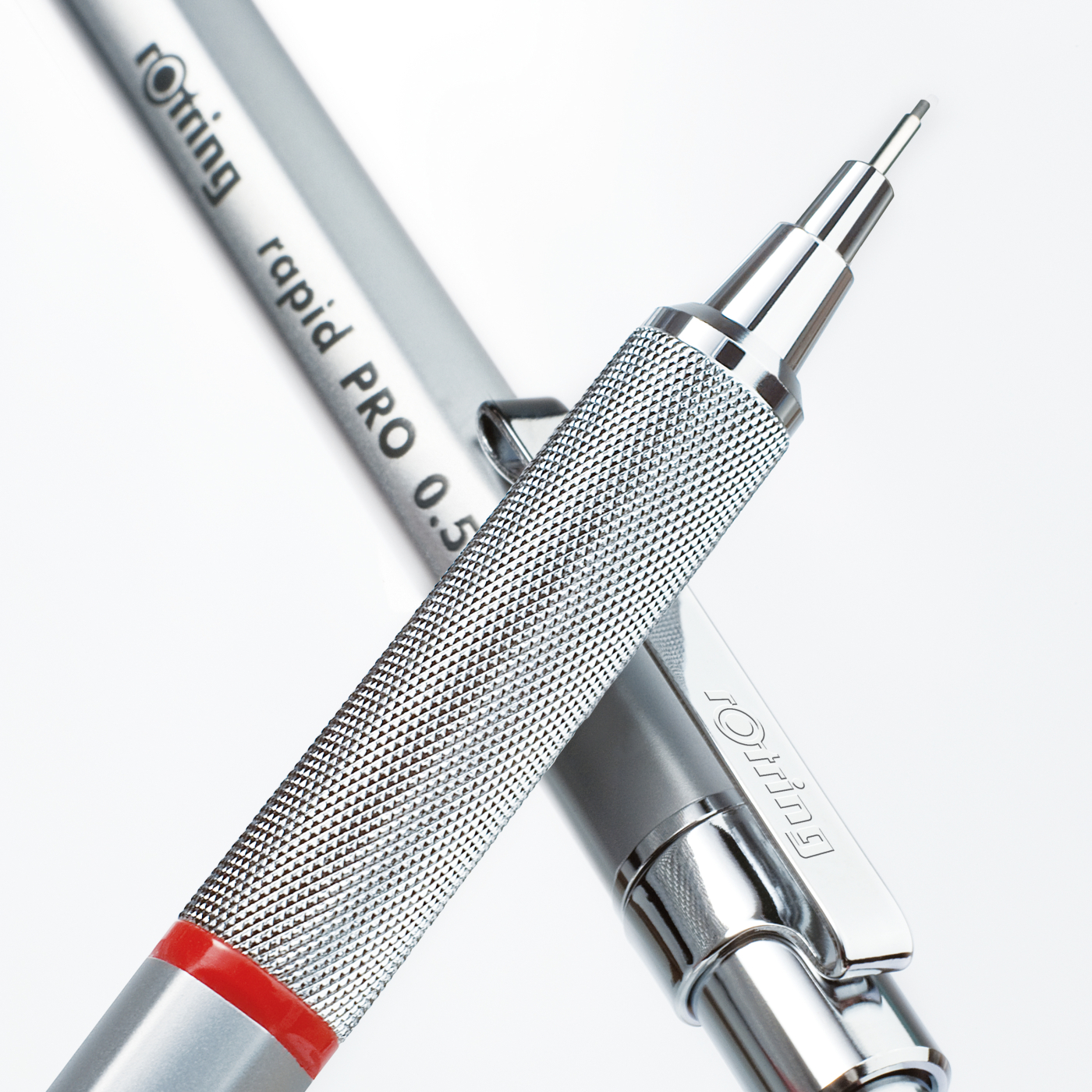 Porte-mine Rotring Rapid Pro avec un design fonctionnel rappelant le Rotring 600 classique. Corps en métal noir avec partie supérieure de forme hexagonale. La partie inférieure cylindrique comporte des rainures pour une très bonne prise et plus de précision. Le porte-mine a un clip en métal amovible et un gomme sous le capuchon. Porte-mine 0,5 mm, tube de support mobile. Dans un emballage cadeau.