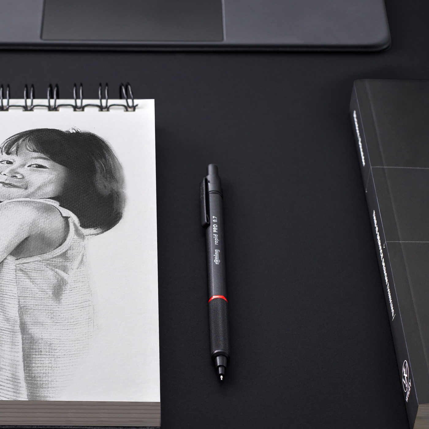 Porte-mine Rotring Rapid Pro avec un design fonctionnel rappelant le Rotring 600 classique. Corps en métal noir avec partie supérieure de forme hexagonale. La partie inférieure cylindrique comporte des rainures pour une très bonne prise et plus de précision. Le porte-mine a un clip en métal amovible et un gomme sous le capuchon. Porte-mine 0,7 mm, tube de support mobile. Dans un emballage cadeau.