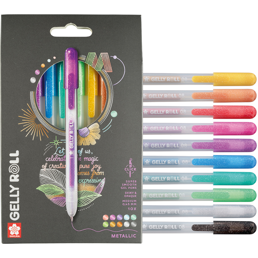 L’ensemble contient 10 stylos gel rétractables en couleurs métalliques : rouge, rose, violet, bleu, vert, émeraude, or, argent, cuivre et noir.