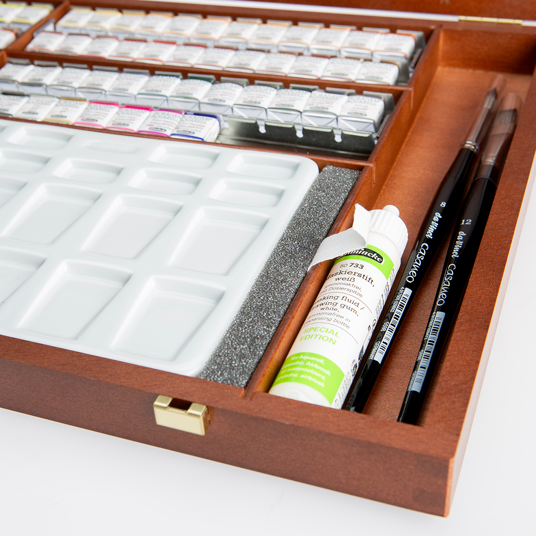 Le coffret en bois comprend également une palette en porcelaine, un stylo de masquage et deux pinceaux da Vinci.