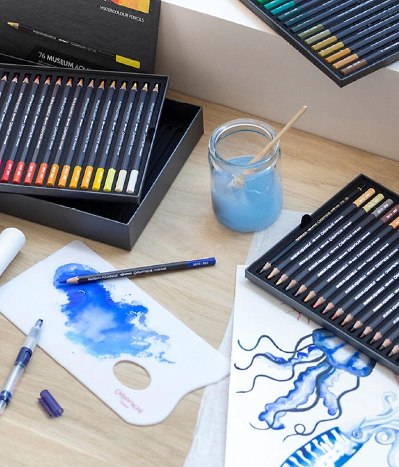 Quand je crée, j’aime utiliser des matériaux qui ont un petit côté vivant et qui apportent quelque chose de ludique. Les couleurs Super granulation de Schmincke réagissent et changent de façon à révéler des formes et des motifs pendant que je peins, donc je n’ai pas toujours besoin de commencer avec une idée précise. Je laisse les choses venir. J’adore explorer les possibilités des matériaux et voir comment les utiliser d’une manière un peu “différente”. Gansai Tambi peut donner un effet aquarelle, mais s’utilise aussi comme de la gouache, et Neocolor II fonctionne à la fois comme un pastel et une aquarelle.