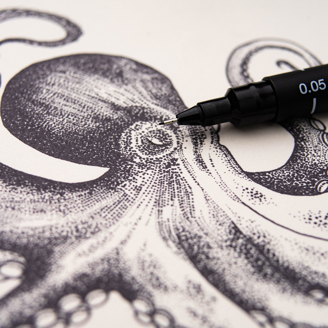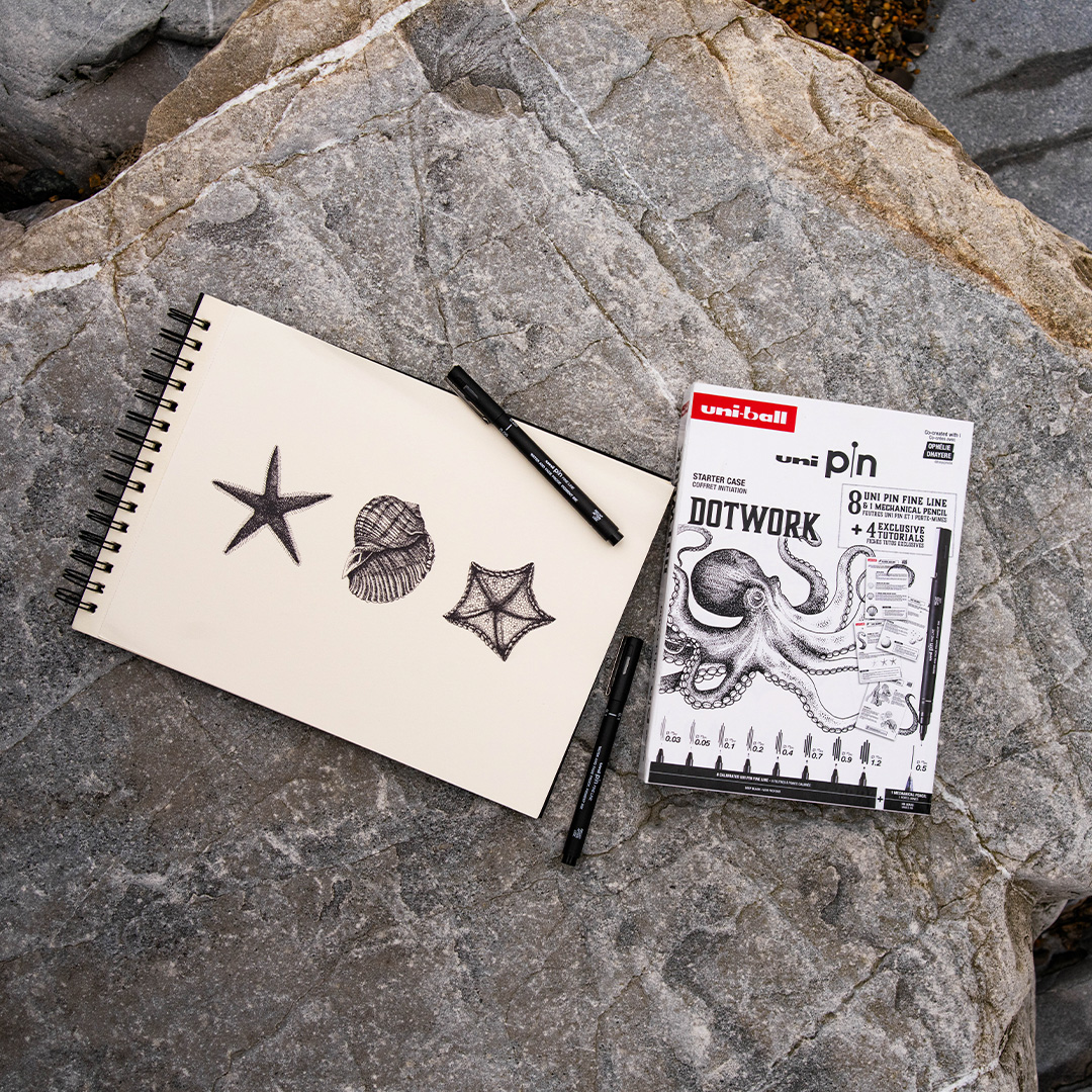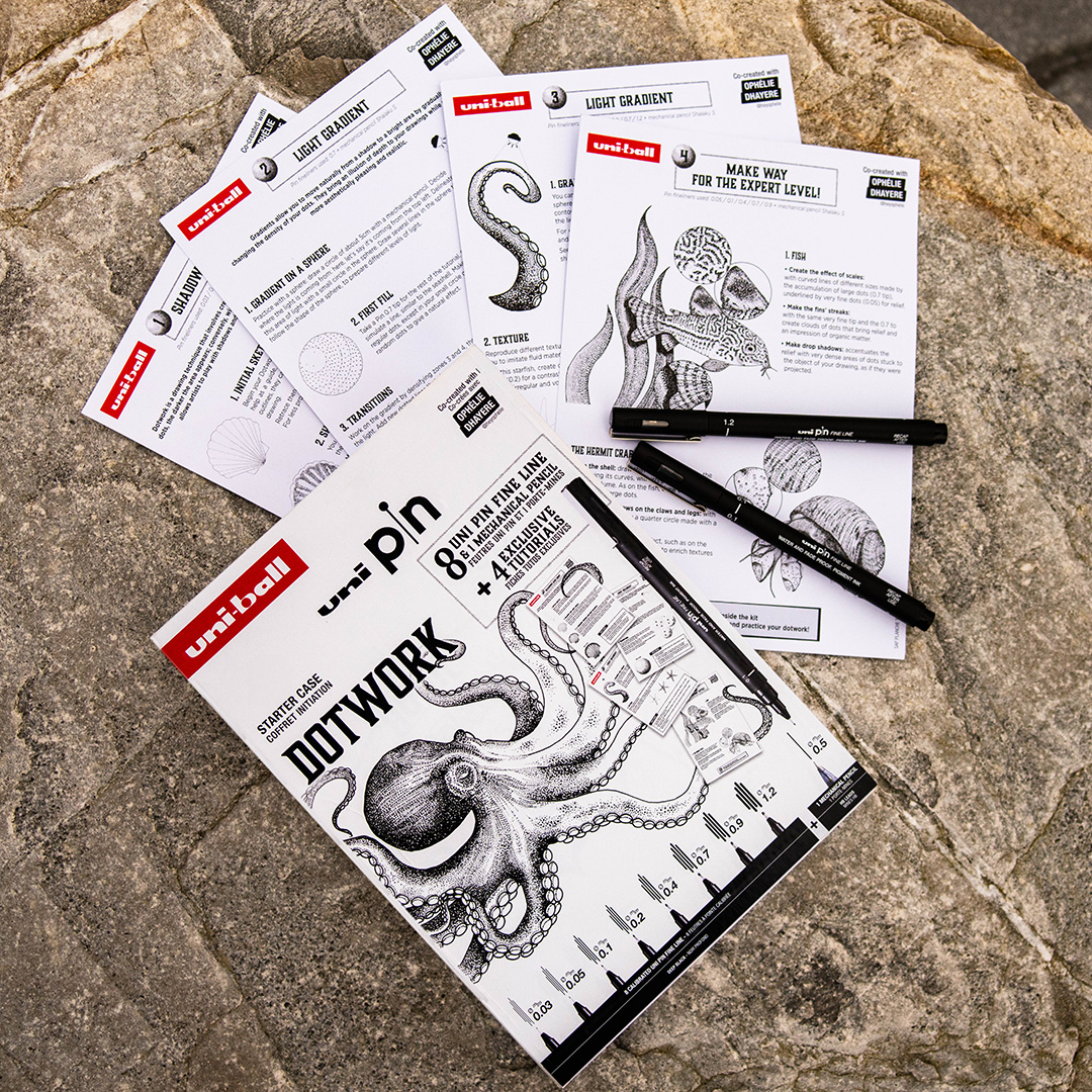 Ce coffret a été spécialement conçu pour offrir précision et contrôle, aboutissant à des illustrations réalistes avec des ombres et une profondeur impressionnantes. Il comprend huit fineliners de différentes tailles de pointe et un porte-mines mécanique de 0,5 mm. Le set contient également du matériel inspirant et pédagogique sous forme de quatre fiches d’instructions et d’un livret qui aide aussi bien les débutants que les artistes confirmés à perfectionner leur technique et à créer leurs propres œuvres uniques en dotwork.